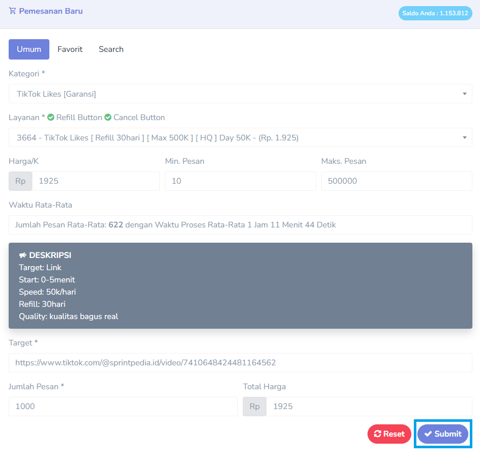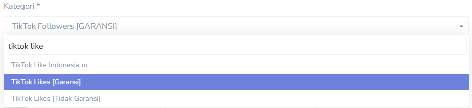 TikTok Likespada formulir pemesanan, lalu pilih salah satu kategori sesuai dengan layanan yang ingin Anda pesan.