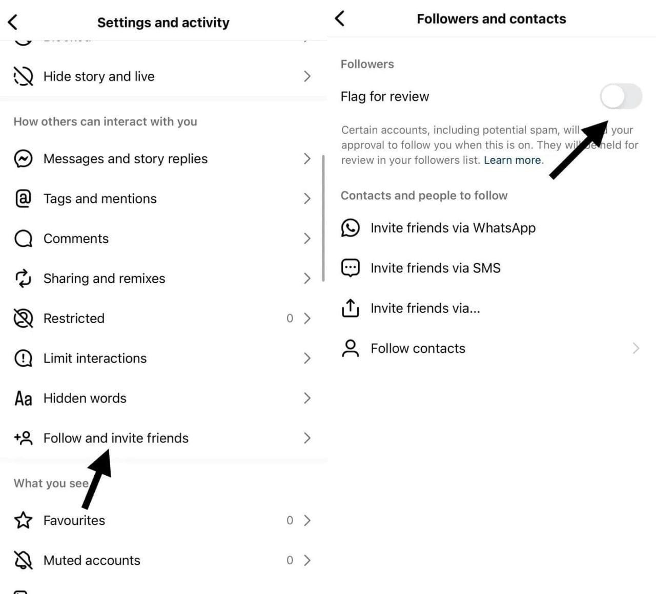 - Cari opsi Tandai untuk Ditinjau, lalu hapus centangnya. Langkah ini penting agar setiap pengikut baru dapat langsung ditambahkan ke akun Anda. Jika opsi ini tidak diatur, pengikut baru akan masuk ke dalam folder “Ditandai untuk Ditinjau” terlebih dahulu.